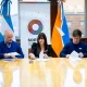 La titular de Producción y Ambiente Karina Fernández, junto al Presidente del INFUETUR, Dante Querciali y el representante de la empresa Crustáceos del Sur SA, Hovik...