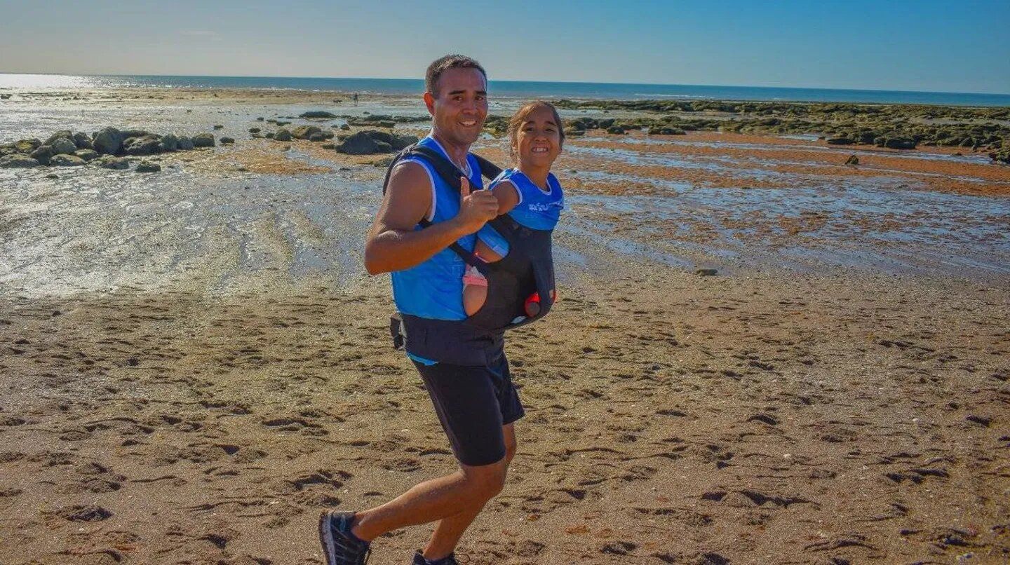 Luz Milagros de 8 años nació sin piernas ni brazos y soñaba con ganar una maratón, su papá la llevó a upa por kilómetros y vivieron la carrera más emocionante de sus vidas en la provincia de Río Negro